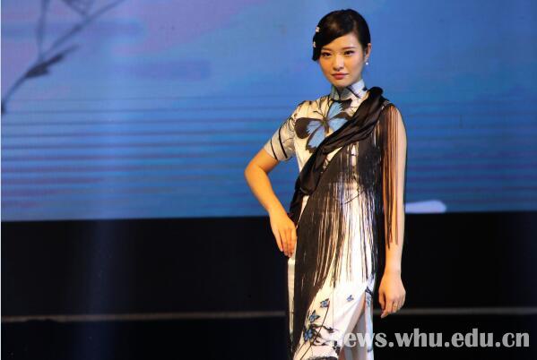 ▲鱼尾的摇曳,流苏的性感,独袖的潇洒,青瓷的古典,龚航宇校友携手教职工,演绎由她设计的旗袍作品《旗袍·诗·远方》。