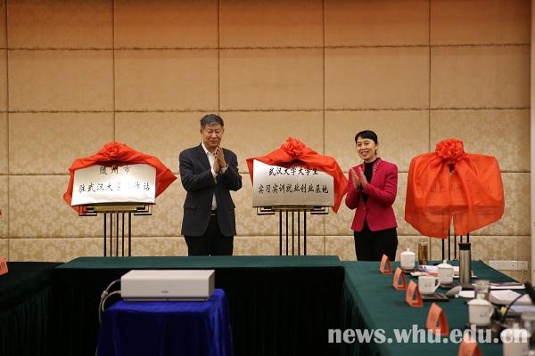 韩进、陈安丽共同为“武汉大学驻随州市工作站”“随州市驻武汉大学工作站”“武汉大学大学生实习实训就业创业基地”“武汉大学农副产品供应基地”揭牌。
