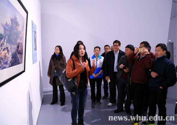 学员们首先来到万林艺术博物馆,参观了“典藏珞珈”绘画作品展。城市设计设计学院五位创作者王诚浩、温庆武、袁诚、周秀梅、杨青介绍了作品创意及其表达的风物内涵,并与学员们互动交流。随后,学员们分成两组,沿途游览老工学楼(现行政楼)、9.12操场、人文馆、樱花大道、老斋舍、老图书馆、“六一惨案”纪念亭等地。