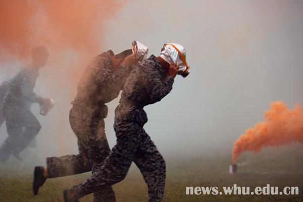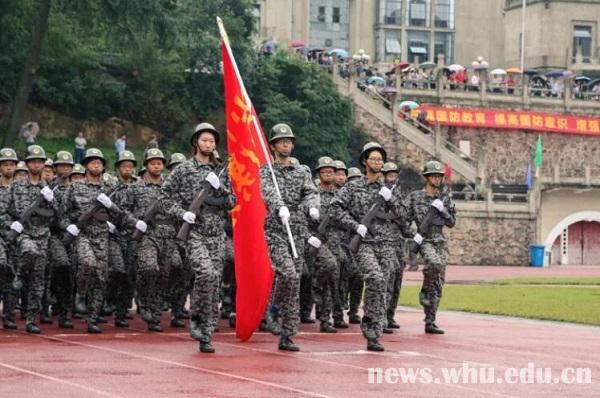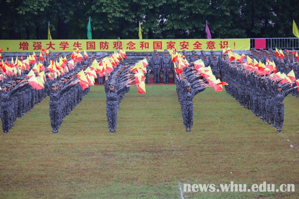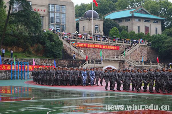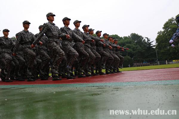 就算是濛濛细雨,也浇灭不了新生们对会操的期待。军歌嘹亮,口号铿锵,步伐一致,令人心潮澎湃。