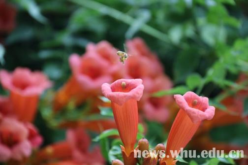教五广场上那灿烂的凌霄花是否吸引了你的目光?毕业时节,绽放出一朵朵火红的“小喇叭”,为学子们吹奏一曲临别的歌。